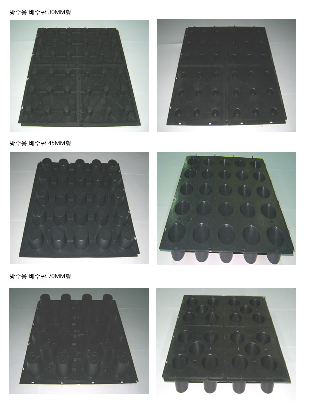 명칭 규격 수량산출 방수용 배수판 30mm형 500 X 500 X H30mm 4장/m² 방수용 배수판 45mm형 500 X 500 X H45mm 4장/m² 방수용 배수판 70mm형 500 X 500 X H70mm 4장/m² -