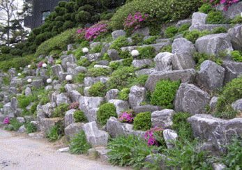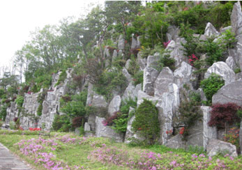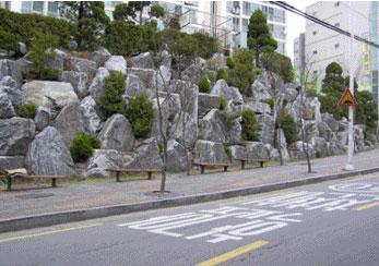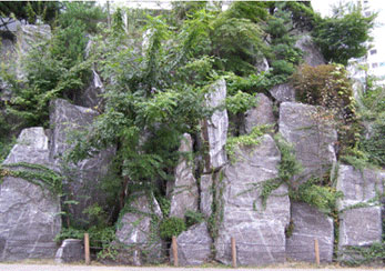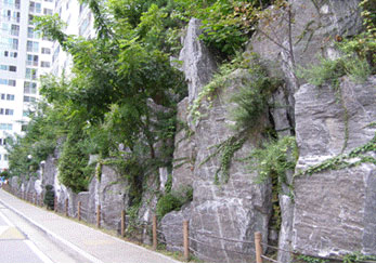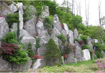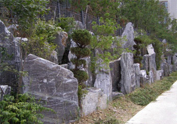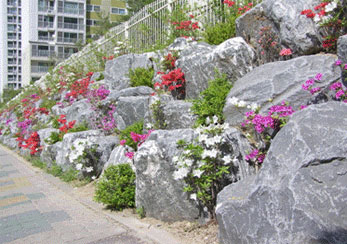 발파대석은 웅장한 멋과 돌무늬의 아름다움을 동시에 만족할 수 있으며, 옹벽 대용으로 사용되며 크기는 2m, 2.5m, 3m 이상급으로 구분됨.